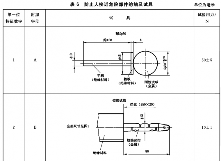 驗證防止人接近危險部件的試具按表6 規定。